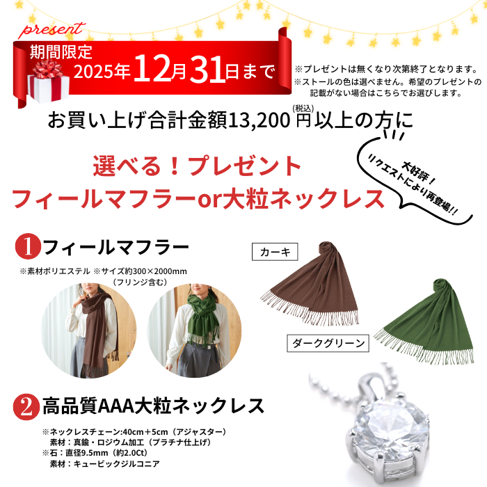 ※マフラーの色は選べません。希望のプレゼントの記載がない場合はこちらでお選びします。またなくなり次第プレゼントは終了となります。
