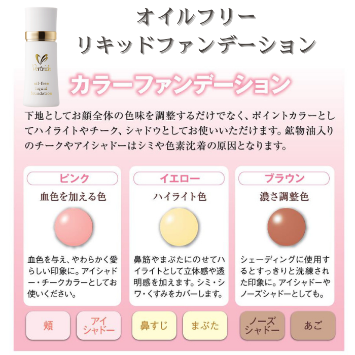 鉱物油入りのチークやアイシャドーはシミや色素沈着の原因となりますが、ベルリッチのカラーファンデーションは水溶性なので、その心配がありません。お顔全体の色味を整えるファンデーションだけでなく、ポイントカラーとして使うものにもこだわることで、素肌を健康に保ちます。