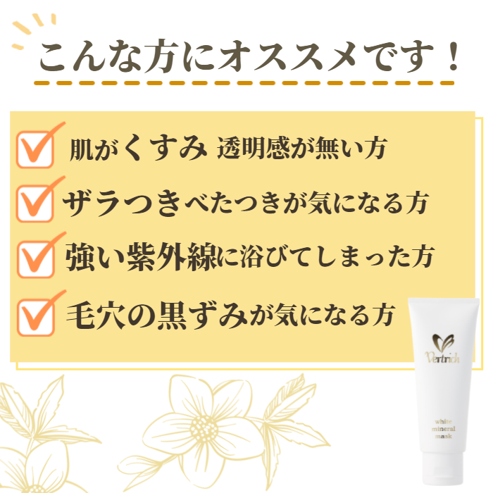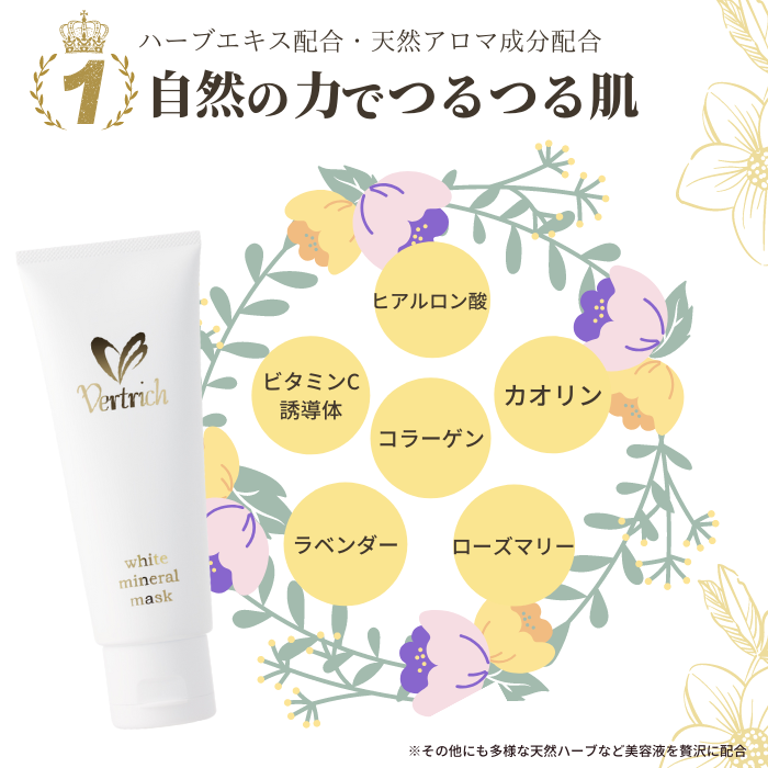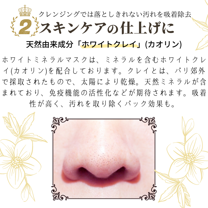 ※ホワイトミネラルマスクは、ミネラルを含むホワイトクレイ(カオリン)を配合しております。