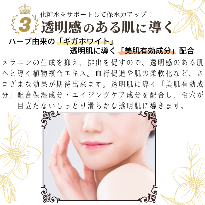 保湿成分・エイジングケア成分を配合し、毛穴が目立たないしっとり滑らかな透明肌に導きます。