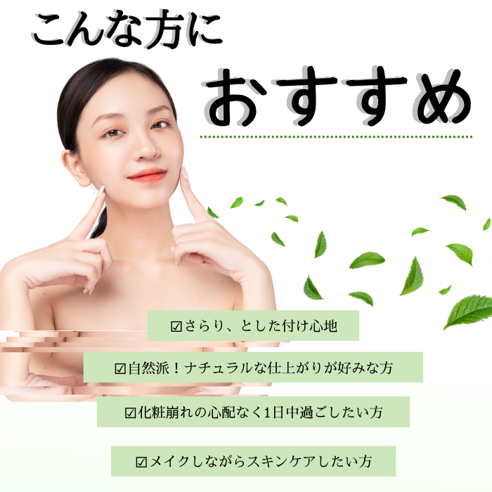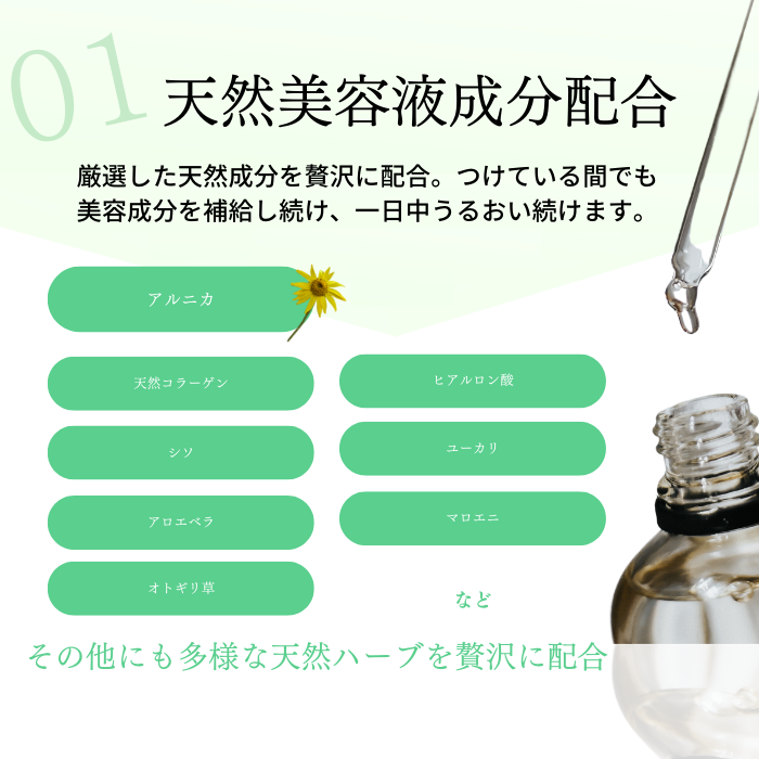 天然ハーブやコラーゲン・ヒアルロン酸などを配合しているため、メイクしながら、美容成分をしっかりお肌に補給し、なめらかな素肌をつくります。