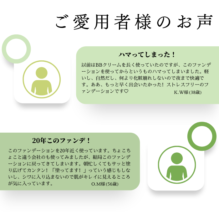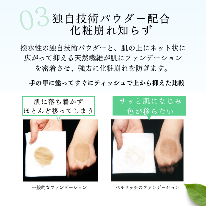 はっ水性の独自のパウダーを使用していることと、植物ゲルに含まれる繊維がネット状に広がってパウダーを押さえることで、お肌にファンデーションを密着させ、強力に化粧崩れを防ぎます。