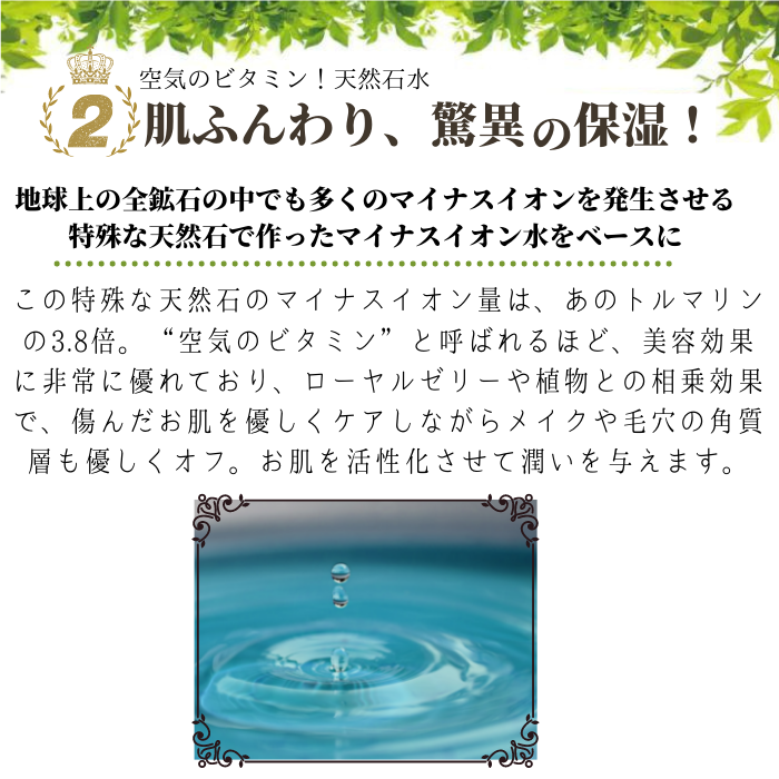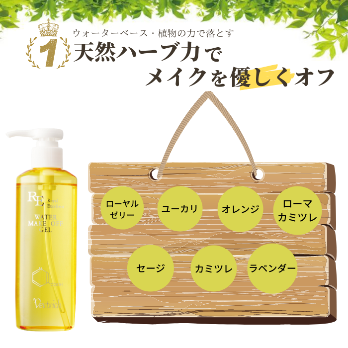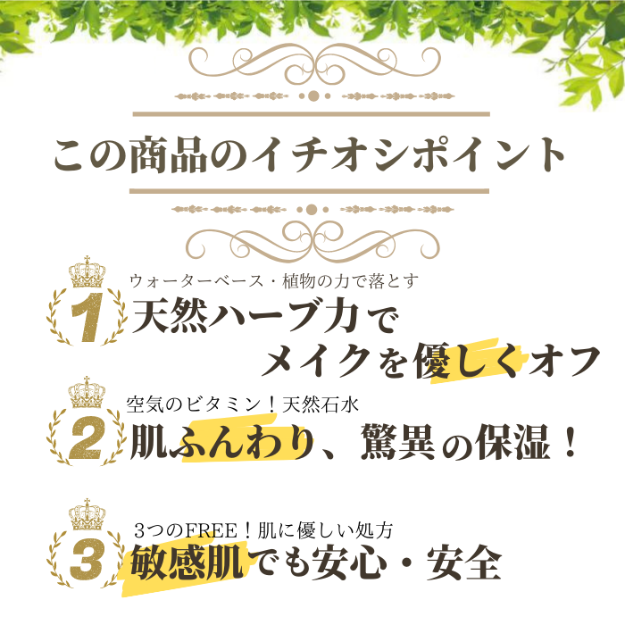 お肌に負担をかけるオイルとアルコールをカットし、マイナスイオン水ベースに仕上げたメイク落としです。ハーブの力でスキンケアしながらメイクを落とす優れもの。程よい粘性を持ち、洗浄力はオイル並み。ウォーターリキッドだから、べたつきのないさっぱりとした洗い上がりです。合成界面活性剤不使用でお肌に優しく落ちにくいメイク汚れ・くすみ・毛穴の角栓もしっかり落とします。