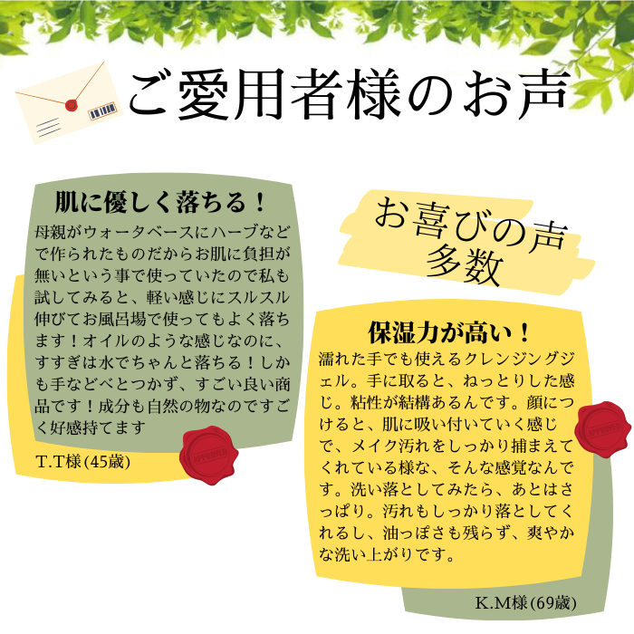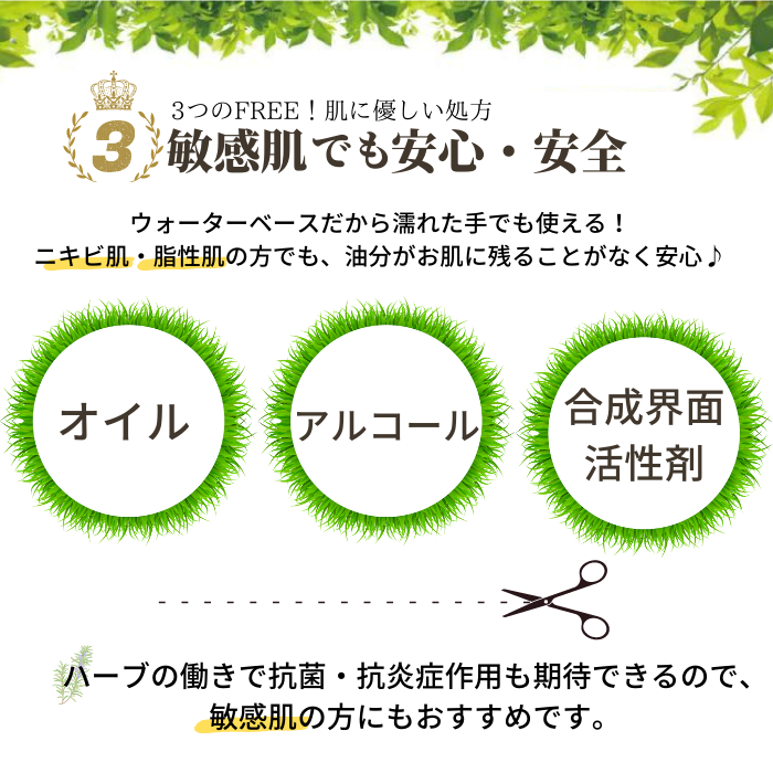 合成界面活性剤不使用の植物性メイク落とし。ユーカリ・セージ・カミツレ・ラベンダーなどのハーブの働きで抗菌・抗炎症作用も期待できるので、敏感肌の方にもおすすめです。