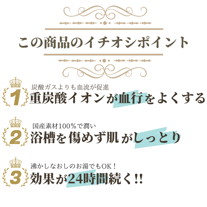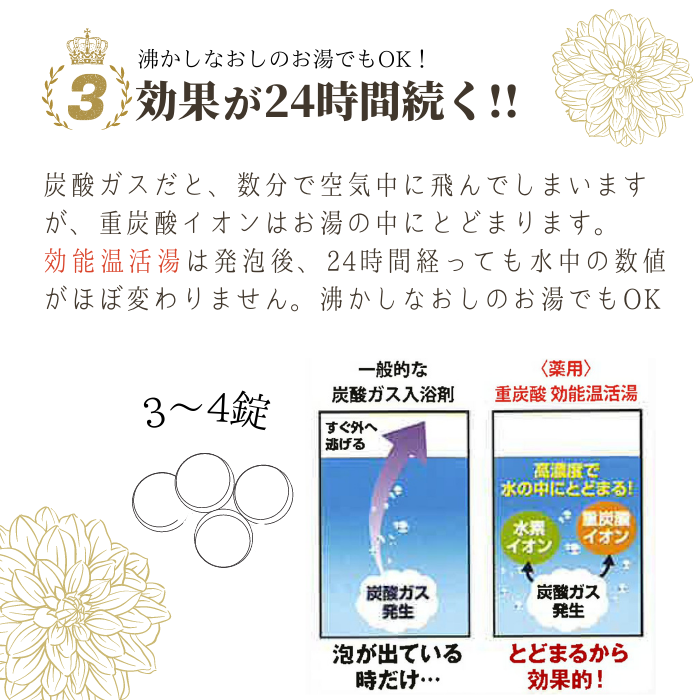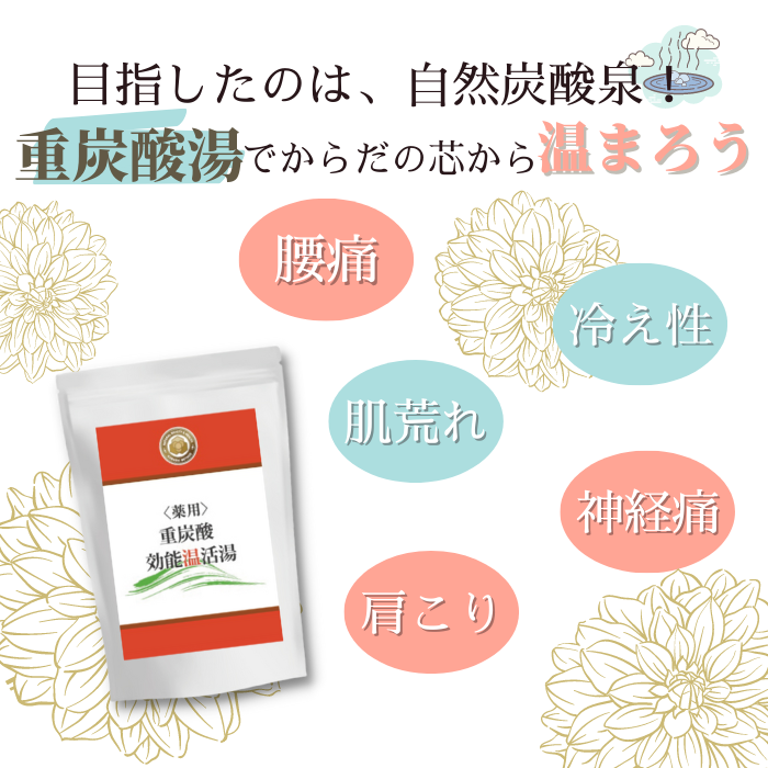 積み上げた研究・開発のノウハウにより、重曹とクエン酸の錠剤化に成功した全く新しい入浴剤。温浴効果により、血流を高め、体を温め、温まり感が持続します。無香料・無着色の柔らかいお湯が優しく肌を包み、清浄効果により肌を清潔にします。