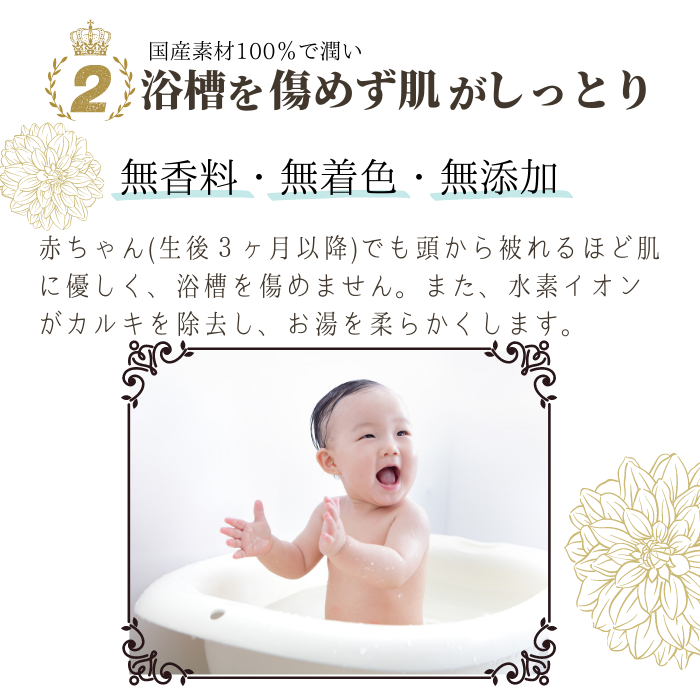 ●残り湯には無機塩類が含まれていますので植物の水やり等には使わないでください。