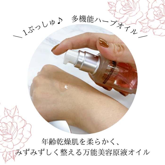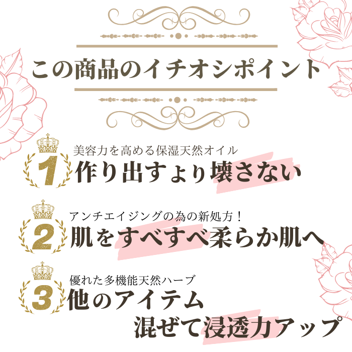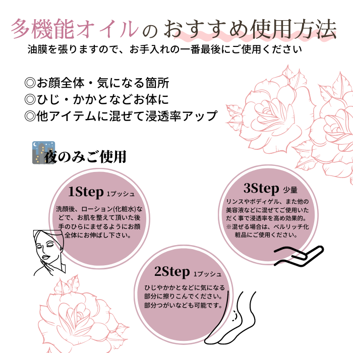 夜のお手入れの最後に1、2滴を顔全体、もしくは気になる部分にお付けください。