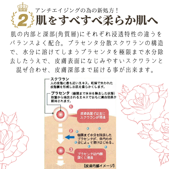 ハイブリッドサフラワー油,ホホバ油,ヒマワリ種子油,ワサビノキ種子油,スクワラン,パーシック油,ククイナッツ油,プラセンタエキス,アルガニアスピノサ核油,テトラヘキシルデカン酸アスコルビル,オリーブ油,アーモンド油,ブドウ種子油,トコフェロール,ゼリーエキス,ローズ油