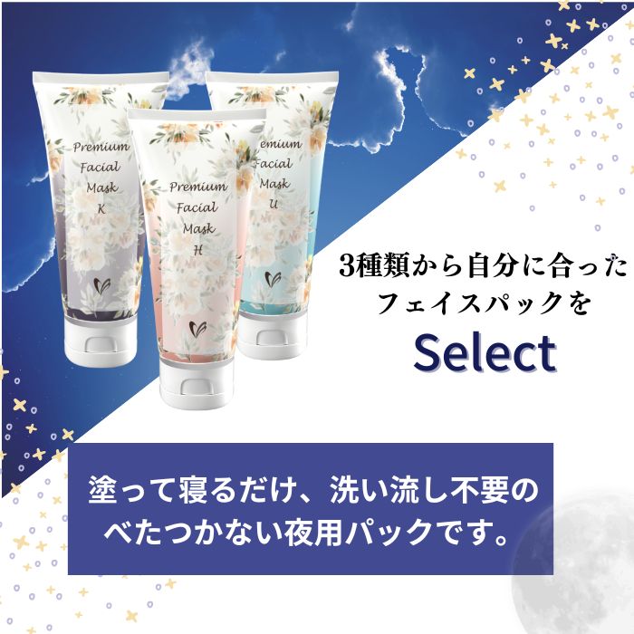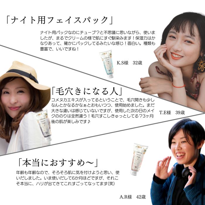 伸びがよく、まるでシートマスクを一晩中つけているかのような感覚で、寝ている間に美肌へサポートします。肌悩み別に3種類ご用意しました。