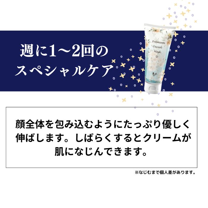 いつものスキンケア後、適量(さくらんぼ大)を手にとり、顔全体を包み込むようにたっぷり優しく伸ばします。しばらくするとクリームが肌になじんできます。そのままおやすみください。なじむ時間には個人差があります。週1~2回のスペシャルケアとしてお楽しみください。